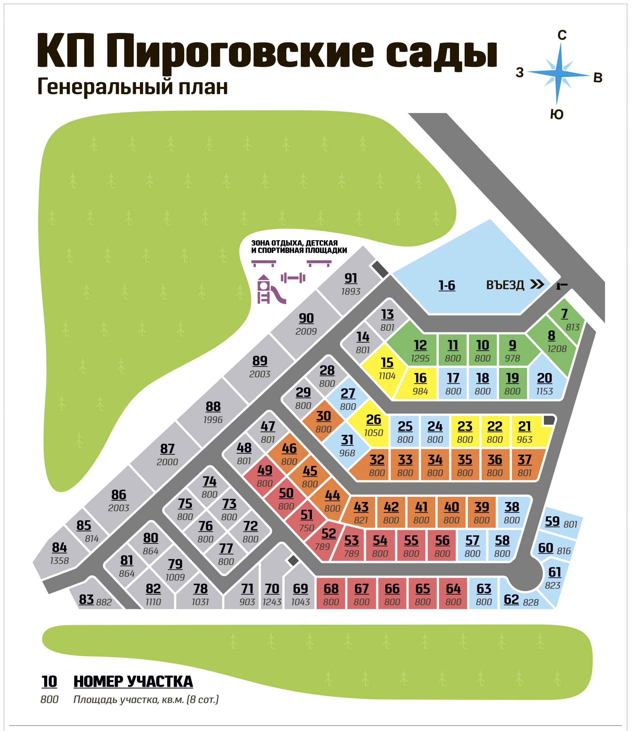 Поселок Пироговские сады насчитывает 83 участка под индивидуальную жилую застройку с площадью от 8 до 12 соток. Он создается на территории 17 га, из них под застройку отведено около 10 га, остальное зона рекреации. Пироговские сады по проекту — это поселок бизнес-класса с въездной группой, пунктом охраны, офисом администрации, специальными техническими зонами для размещения центральных коммуникаций, детской площадкой, спортивными объектами, прогулочной зоной и пр. Обязательным будут единый стиль фронтальных ограждений. Ширина дорог 12–14 метров, что позволит сделать улицы широкими, с пешеходной зоной.